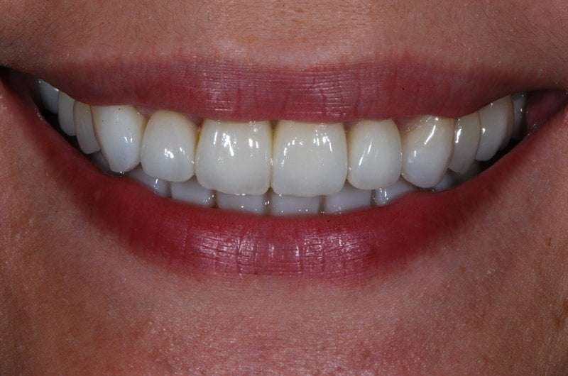 The issue here was the dark metal edges of the crowns showing on her two upper lateral teeth and discolouration to the upper central teeth. A combination of tooth whitening and two new crowns completed her new smile and was done in three visits.