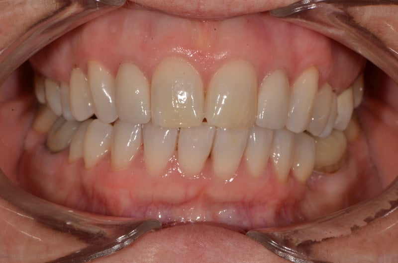 This lady presented with multiple discoloured fillings and crowns on her upper teeth especially. We replaced the old, failing restorations with ten ceramic crowns and veneers to give the patient a more balanced and youthful appearance as well as to strengthen the teeth that had large fillings present.